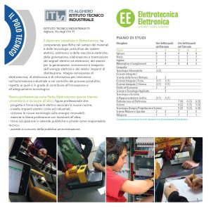 Il diplomato industriale in Elettrotecnica ha competenze specifiche nel campo dei materiali e delle tecnologie costruttive dei sistemi elettrici, elettronici e delle macchine elettriche, della generazione, elaborazione e trasmissione dei segnali elettrici ed elettronici, dei sistemi per la generazione, conversione e trasporto dell’energia elettrica e dei relativi impianti di distribuzione. Integra conoscenze di elettrotecnica, di elettronica e di informatica per intervenire nell’automazione industriale e nel controllo dei processi produttivi, rispetto ai quali è in grado di contribuire all’innovazione e all’adeguamento tecnologico.